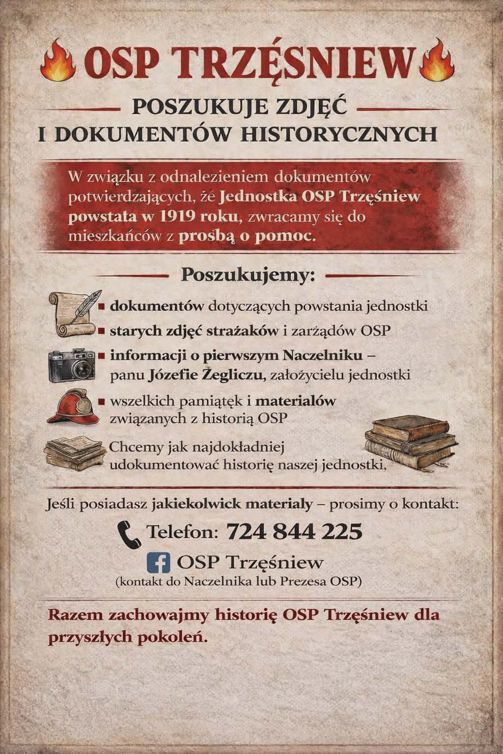 Każda informacja, fotografia czy dokument będą dla nas bezcenne w tworzeniu pełnej historii OSP Trzęśniew i zachowaniu jej dziedzictwa dla przyszłych pokoleń.